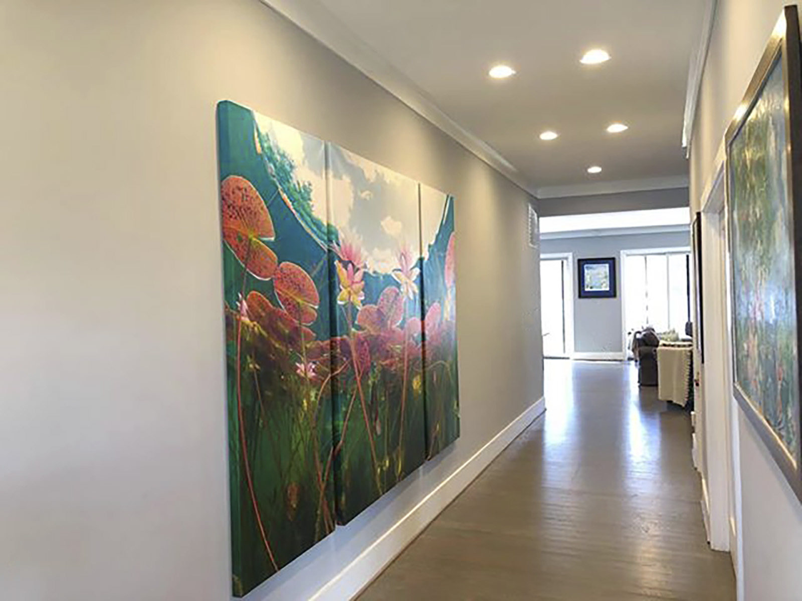 For printing, Lilies In The Sky With Diamonds is flexible for cropping away from it’s native ratio of 3:2, into a 1:1 ratio square, 2:1 panoramic, or even 3:1 panoramic (if you’re okay with cropping out the sunfish), and is available in huge art sizes up to a maximum of 200″ wide. You can purchase this luxury wall art online in our standard sizes, but if you’d like to discuss a custom crop or size, please contact one of our design consultants at the art gallery.
