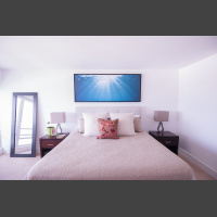 STORY: While so much of my portfolio is vibrant & energetic, sometimes what we need on our walls is a simple & relaxing piece, showing us the quiet beauty that lies within water. For my ultimate relaxation, I enjoy going out onto my backyard beach when the sea is flat calm. Alone, I float on my back, and try to remain completely motionless for as long as I can. It’s therapeutic and meditative. I’ll dip my head back into the water, and from just under the surface, I look up into the sun. This is what I see, and that’s what I wanted to capture here.